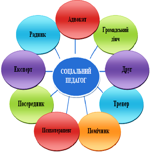 Соціальний педагог – це фахівець із виховної роботи з дітьми, підлітками, молоддю, дорослими, який покликаний створювати сприятливі умови для розвитку та становленню особистості учня. Він виконує роль захисника інтересів та законних прав дітей в школі, сім’ї, соціумі. Соціальний педагог займається індивідуальною роботою з дітьми, підлітками та їх батьками, допомагає сім’ям у вихованні дітей.