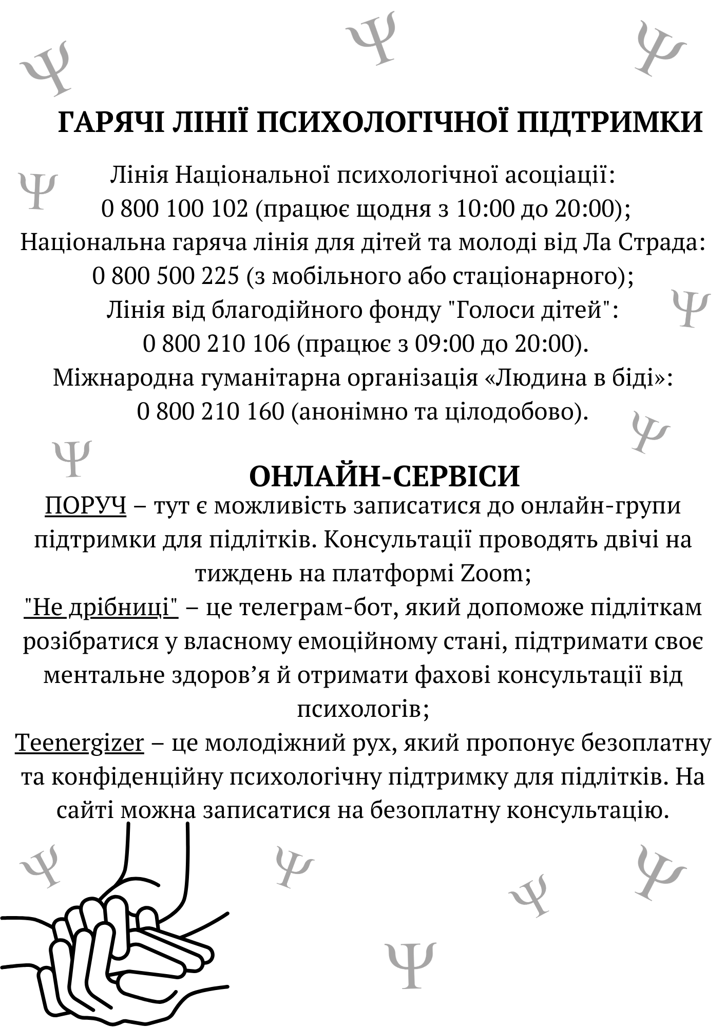 Якщо ви батьки і потребуєте порад та підтримки, щодо виховання дитини з особливими освітніми потребами. Якщо бачите зміни у поведінці та психологічному стані своєї дитини. Коли відчуваєте напругу у спілкуванні з дітьми та хочете налагодити контакт.
