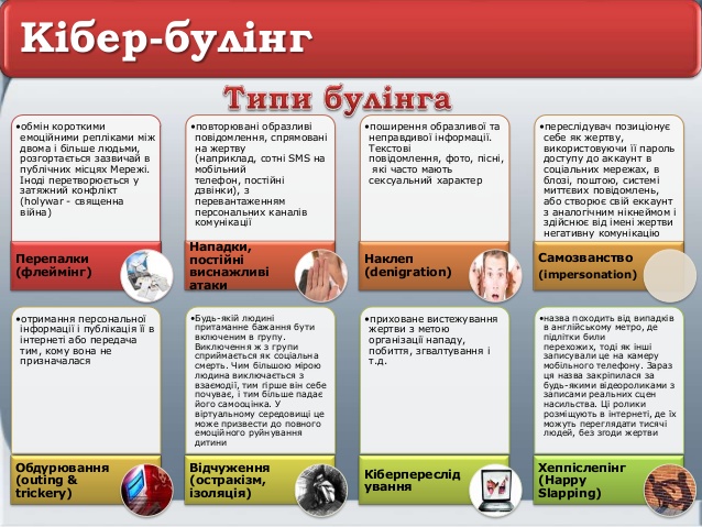 Кібербулінг (пересилка небажаних фото, знімання на відео та поширення в мережі Інтернет, переслідування через соціальні мережі)