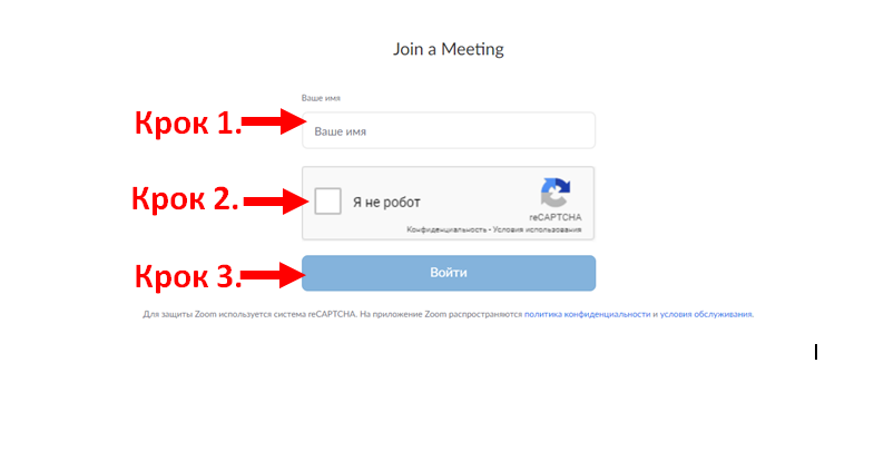 У вас у браузері з’явиться вікно, у якому треба буде ввести своє ім’я і прізвище і натиснути «Я не робот». Тільки після цього натискати «Войти». Введення вашого ім‘я і прізвища – обов’язкова умова для того, щоб ми додали вас у конференцію.