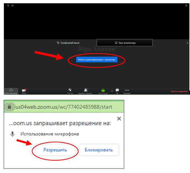 Після початку конференції в браузері перед вами відкриється вікно, у якому треба натиснути «Войти в видеоконференцию»/ «Войти в аудиоконференцию с компьютера». Після цього дозволити доступ браузеру до ваших пристроїв, натиснувши «Разрешить» у віконці, яке з’явиться в лівій верхній частині браузера.