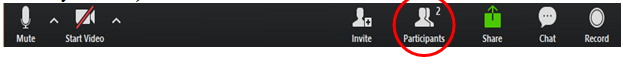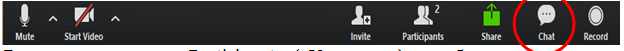 Серед інших пунктів меню, найчастіше використовуються 2 його опції: «Participants» («Учасники») та «Chat» («Чат)». Якщо ви натиснете на «Participants» («Учасники»), ви побачите праворуч список всіх учасників (На даному прикладі показано лише 2 учасника):