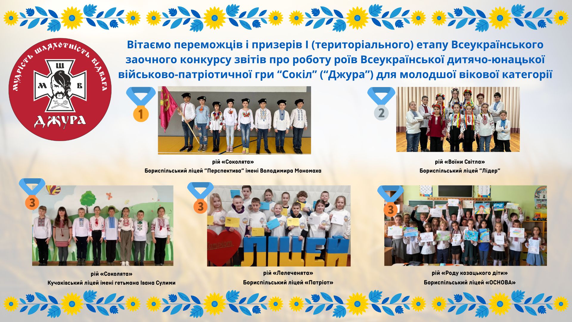 Читати далі...Вітаємо рій “Соколята” з перемогою у І (територіальному) етапі Всеукраїнського заочного конкурсу звітів про роботу роїв Всеукраїнської дитячо-юнацької військово-патріотичної гри “Сокіл” (“Джура”).Дякуємо Чуловської Т. П. за виховання дітей на засадах козацько-лицарських традицій. #dzhura_2024 #Бориспільджура2024 ПЕРЕГЛЯНУТИ ВІДЕО ТУТ